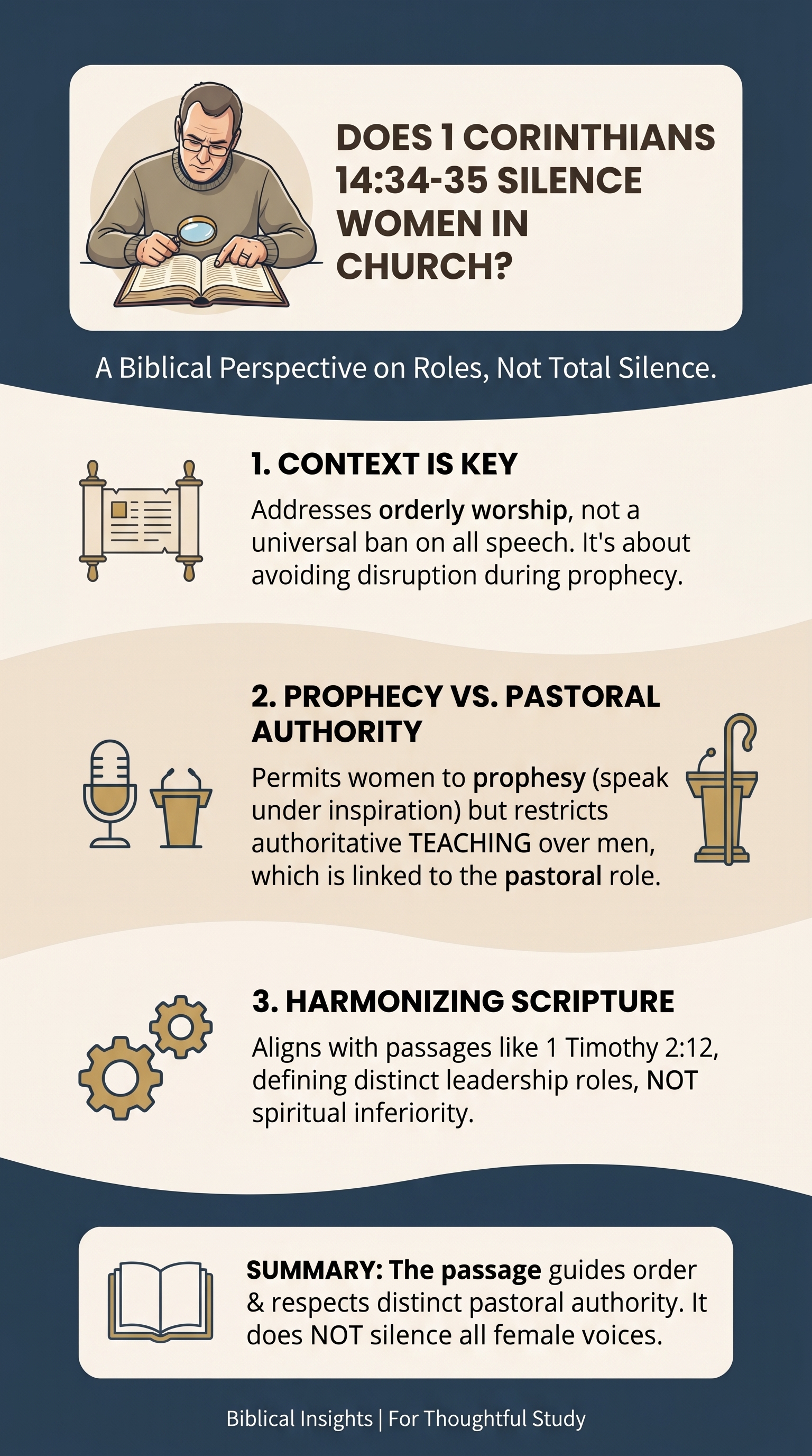 In summary, “keep silent” is best understood as a call for women not to assume authoritative teaching or leadership roles during the church gathering, aligning with the Bible’s broader teaching on church order and leadership.