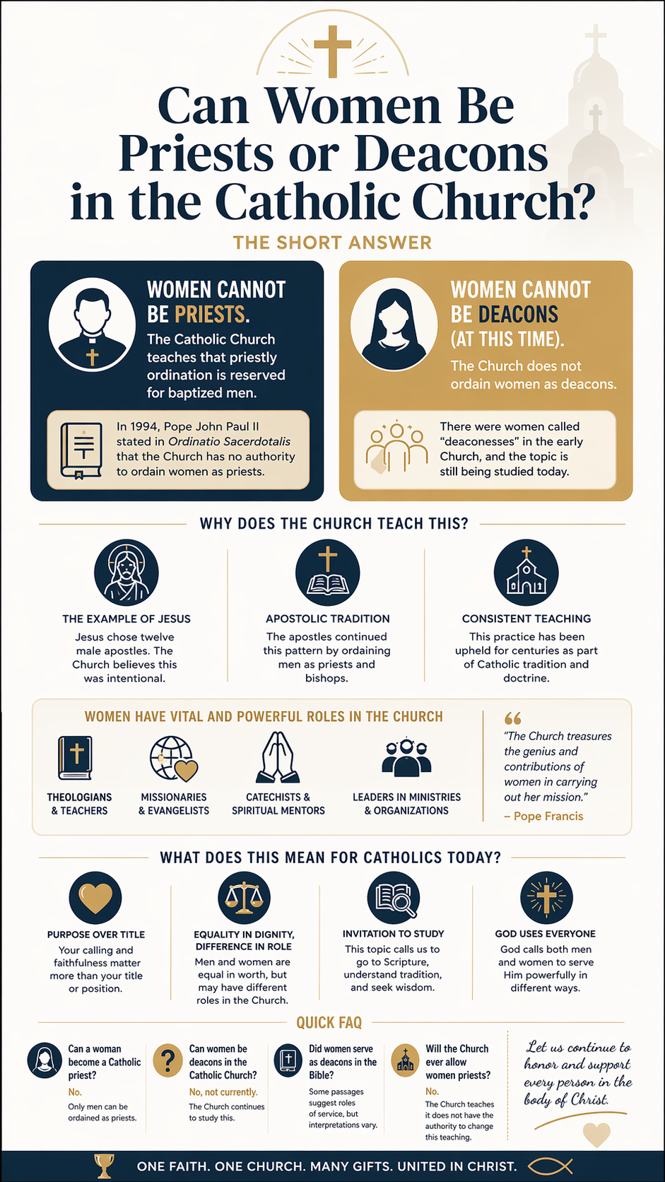 The Catholic Church’s position on women as priests or deacons is clear, rooted in its understanding of Scripture and tradition. At the same time, this topic opens the door for meaningful discussion about roles, calling, and biblical truth.