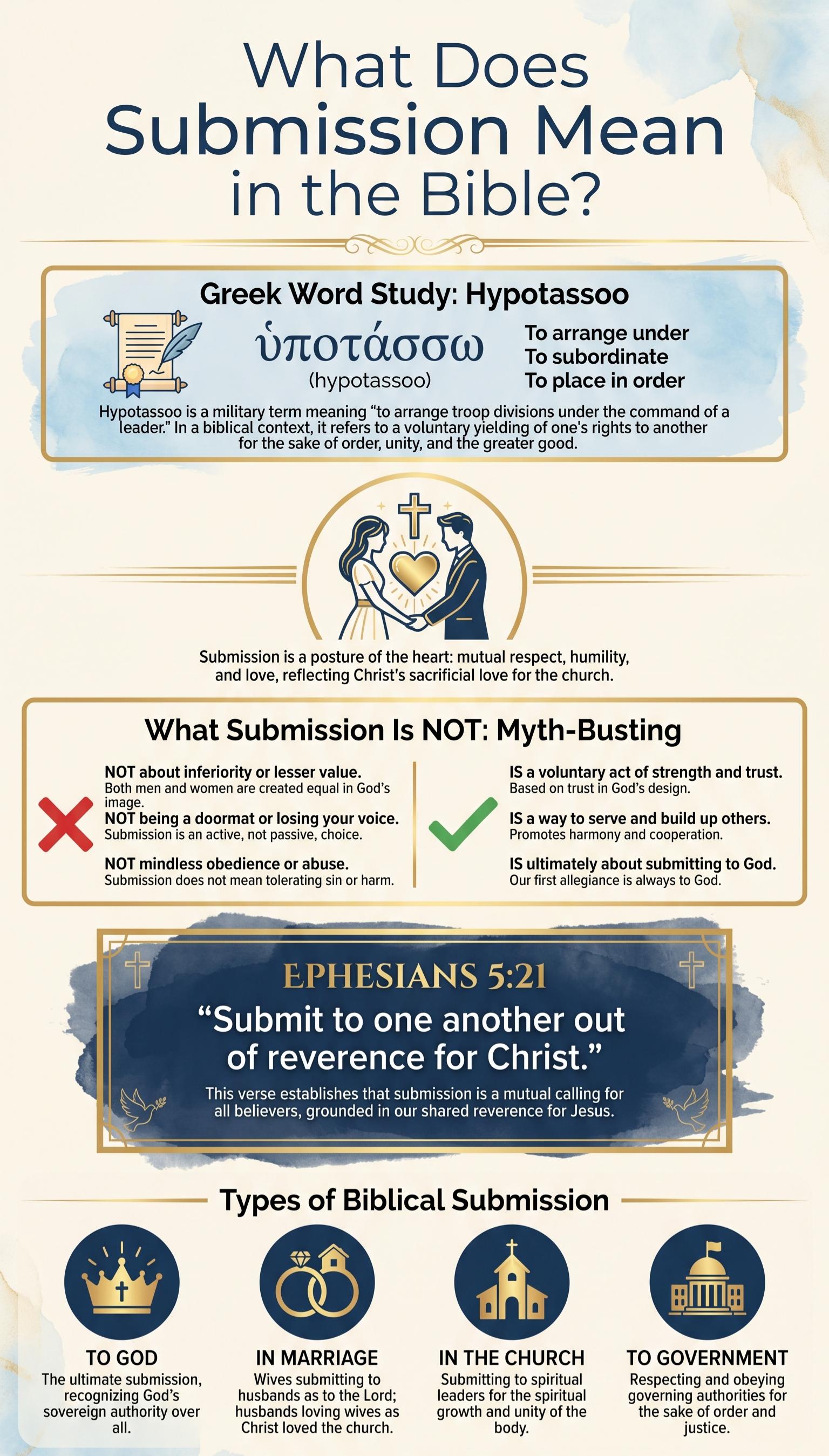 In the Bible, submission (from the Greek hypotassoo) means voluntarily placing yourself under God-ordained authority out of love and reverence for God. It is first and foremost a posture of the heart toward God that flows outward into relationships — in marriage, in the church, and in civic life. Biblical submission is always voluntary, always dignified, and always framed within the larger context of Christlike love.